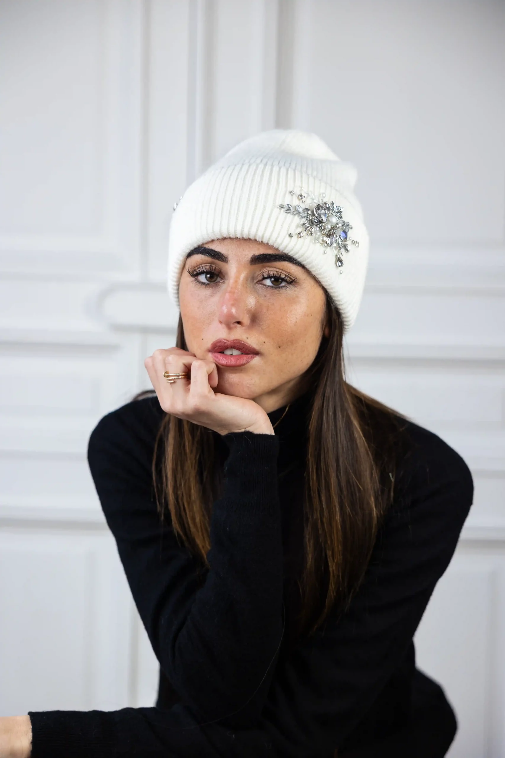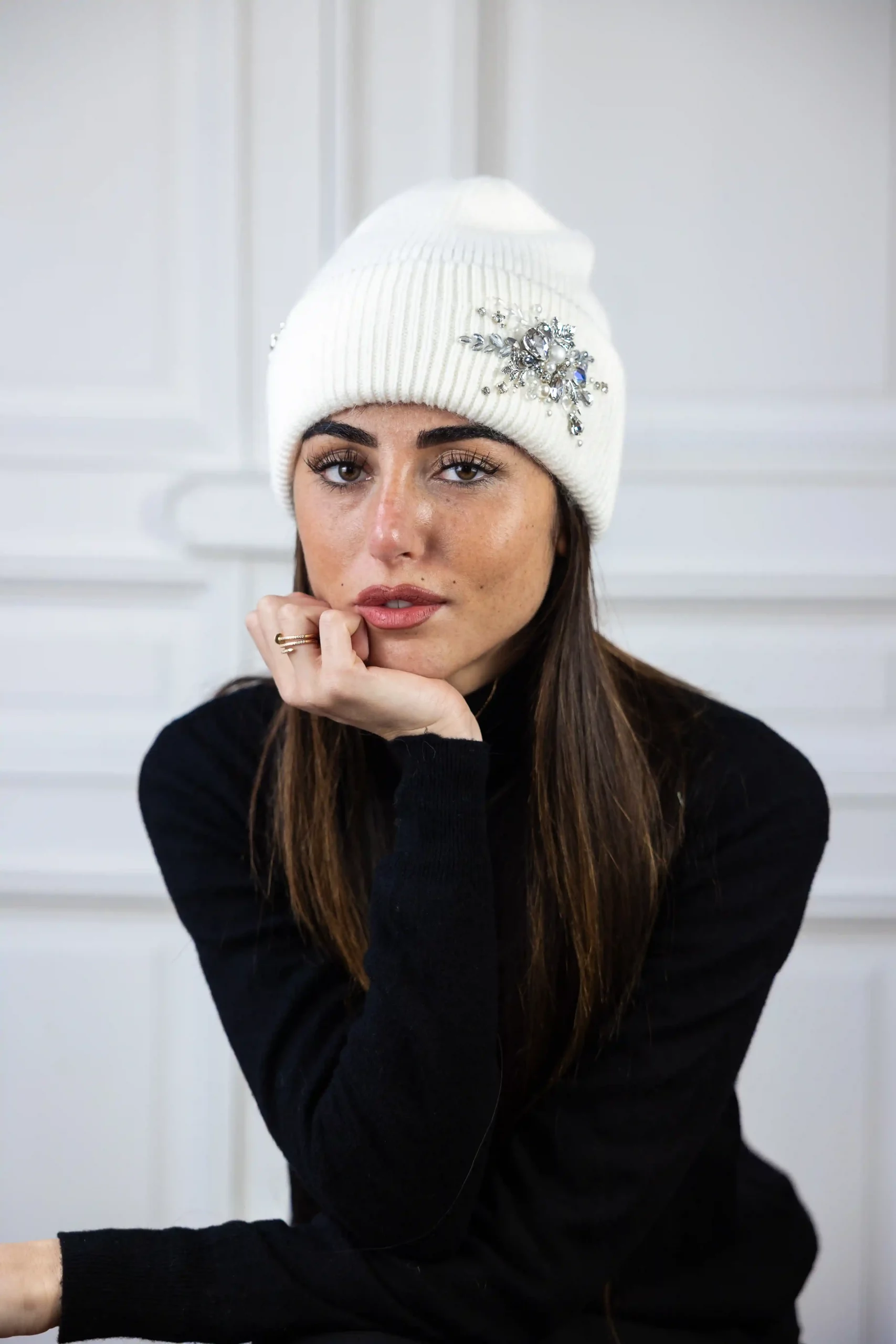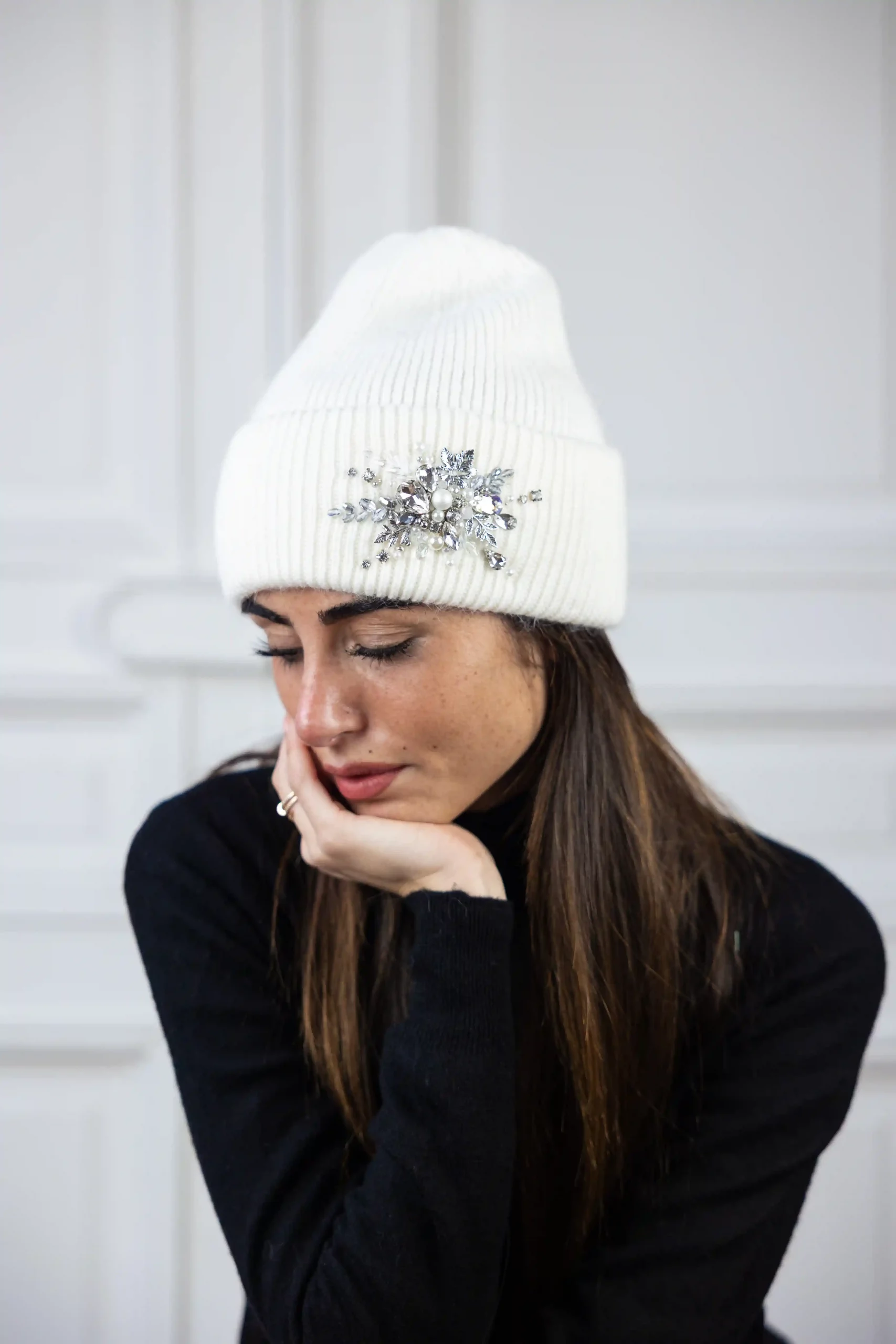Bonnet blanc en angora, doux et chaud, sublimé par une broderie bijou délicate.