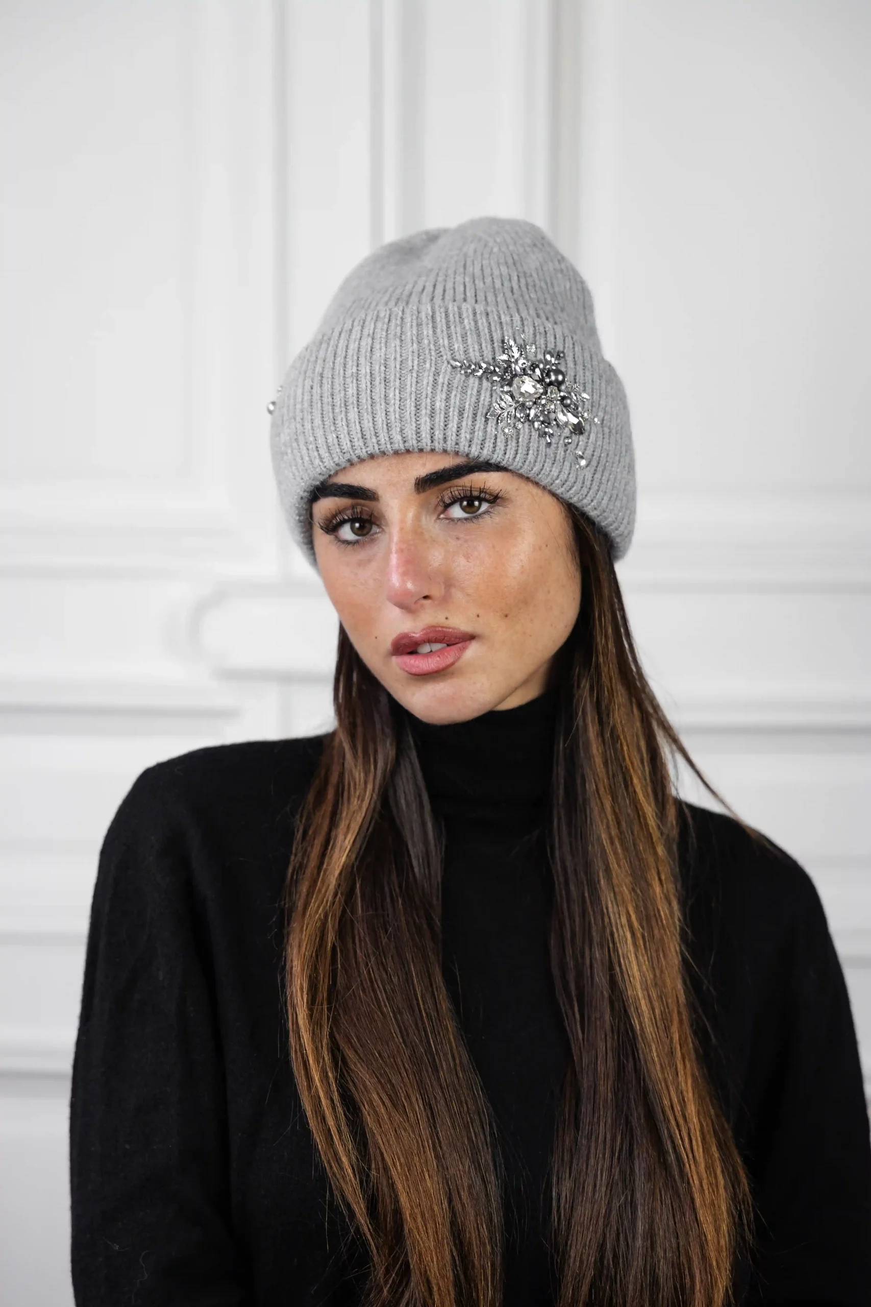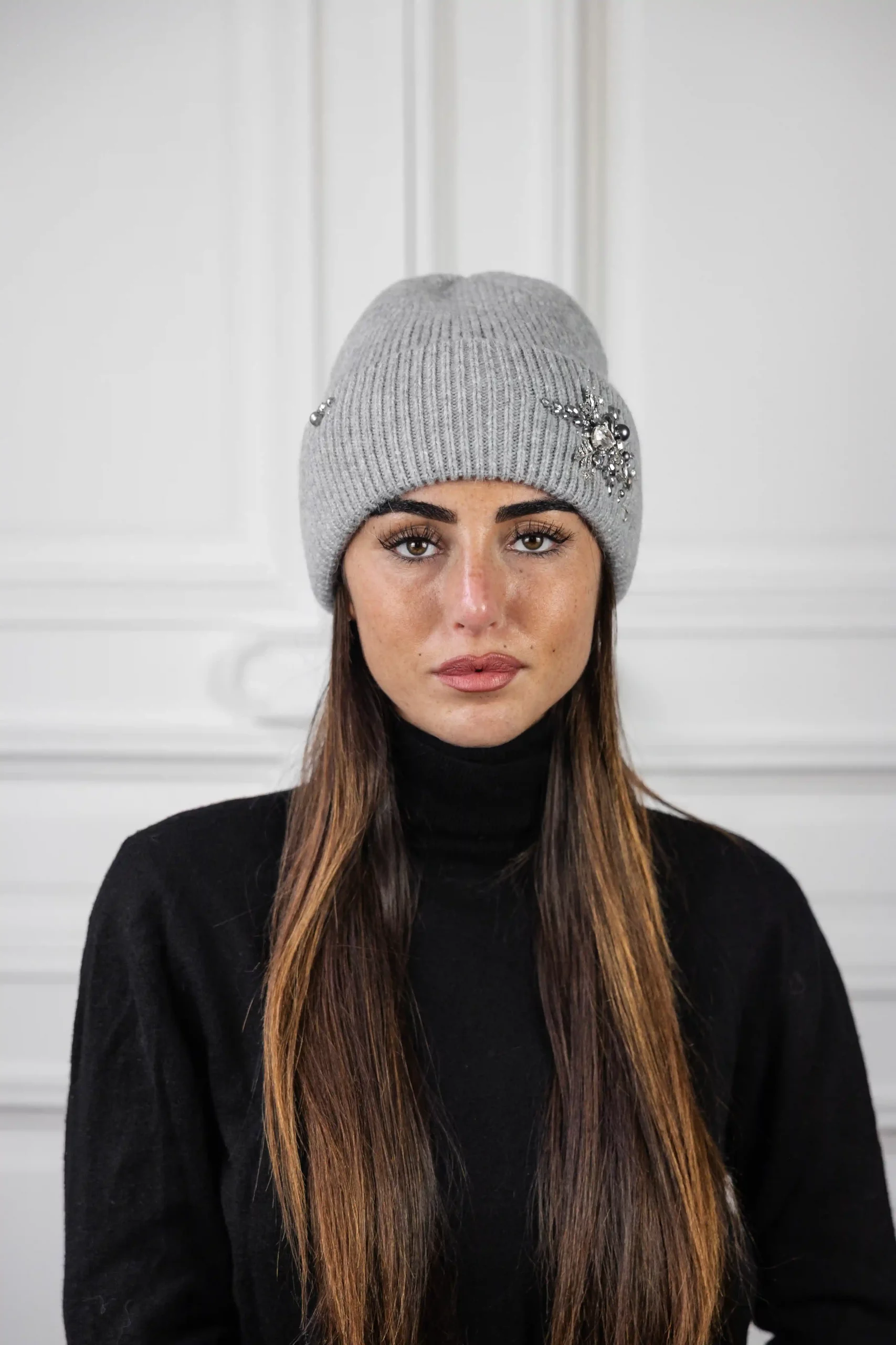 Bonnet gris en angora, doux et chaud, sublimé par une broderie bijou délicate.