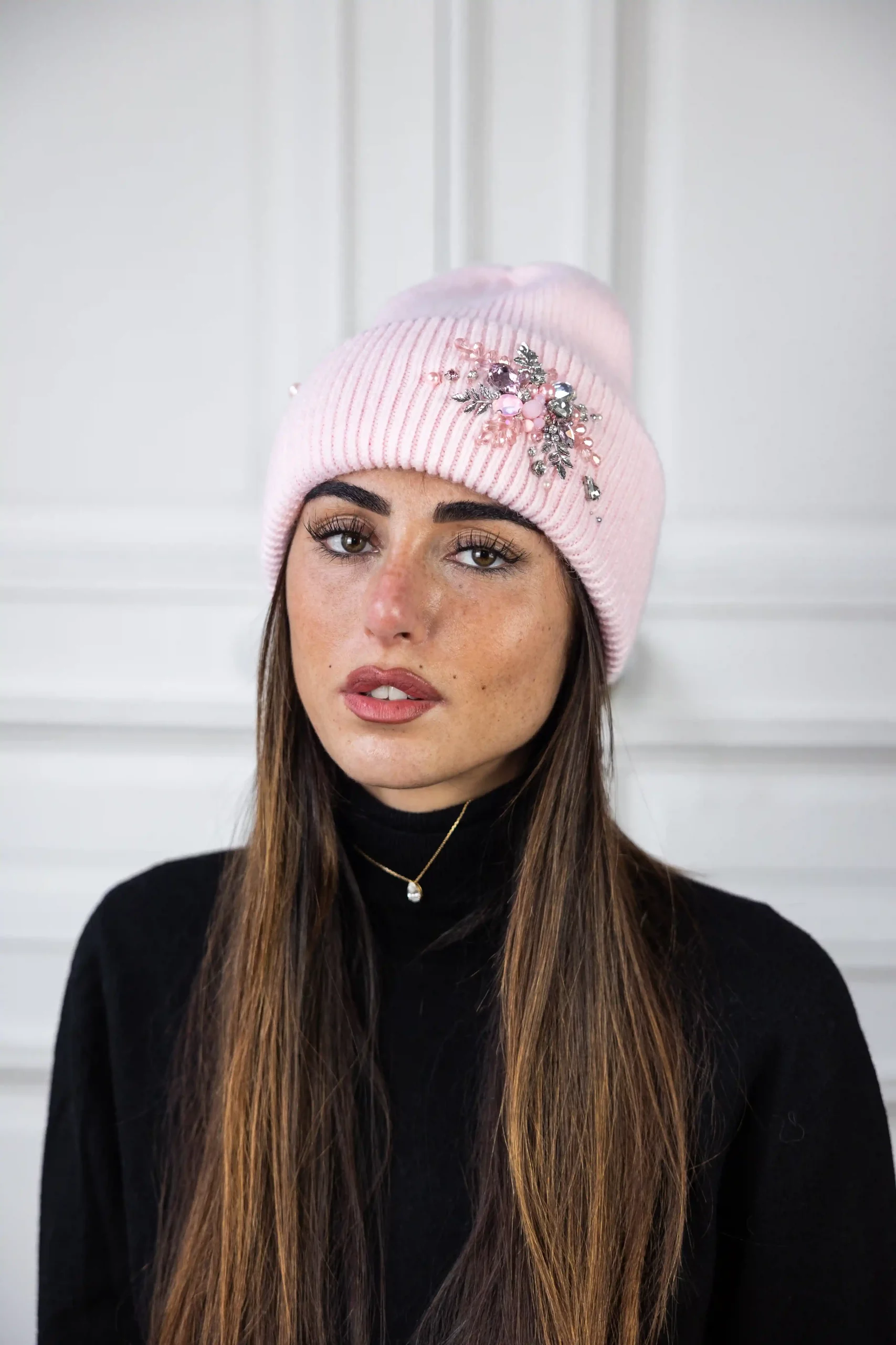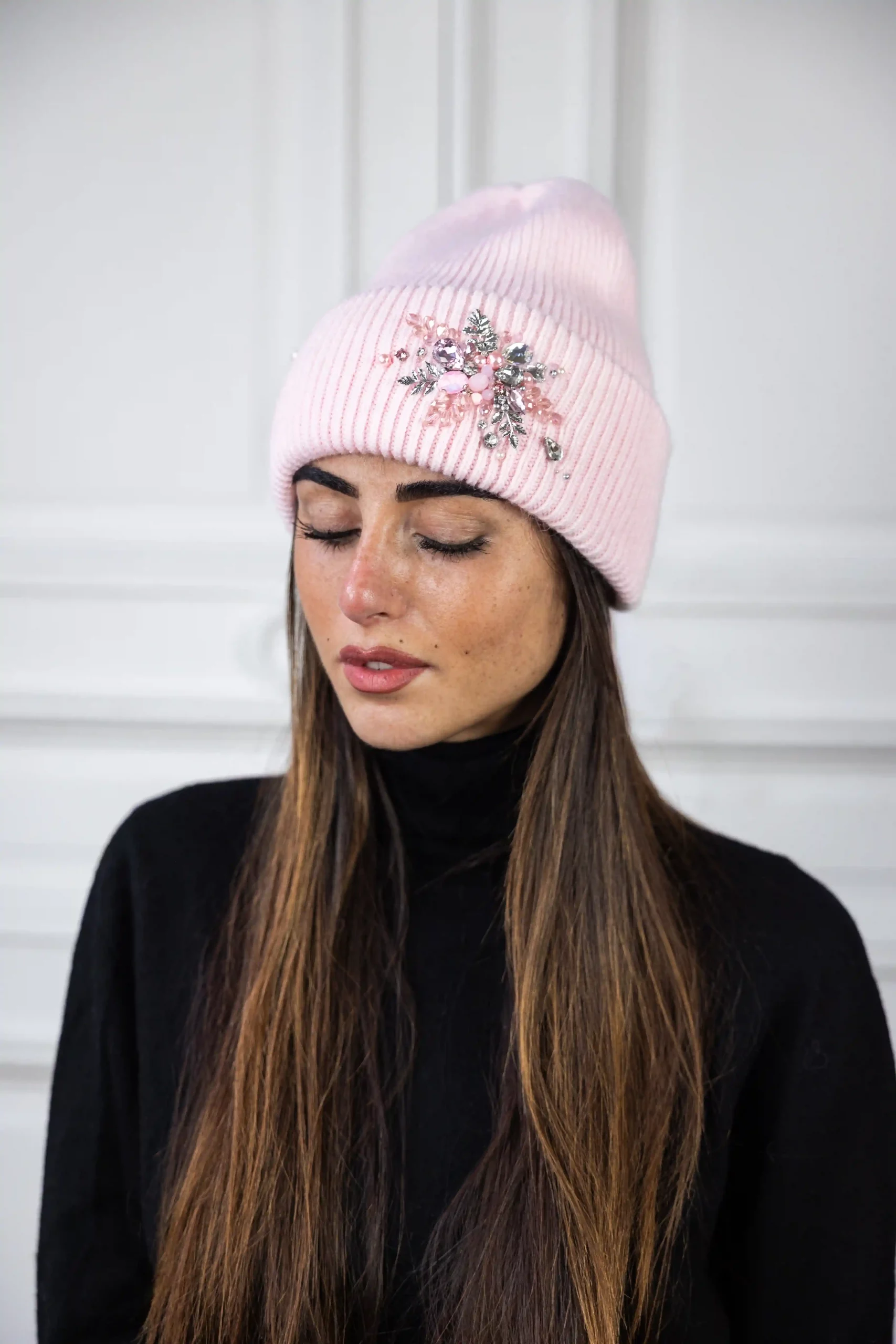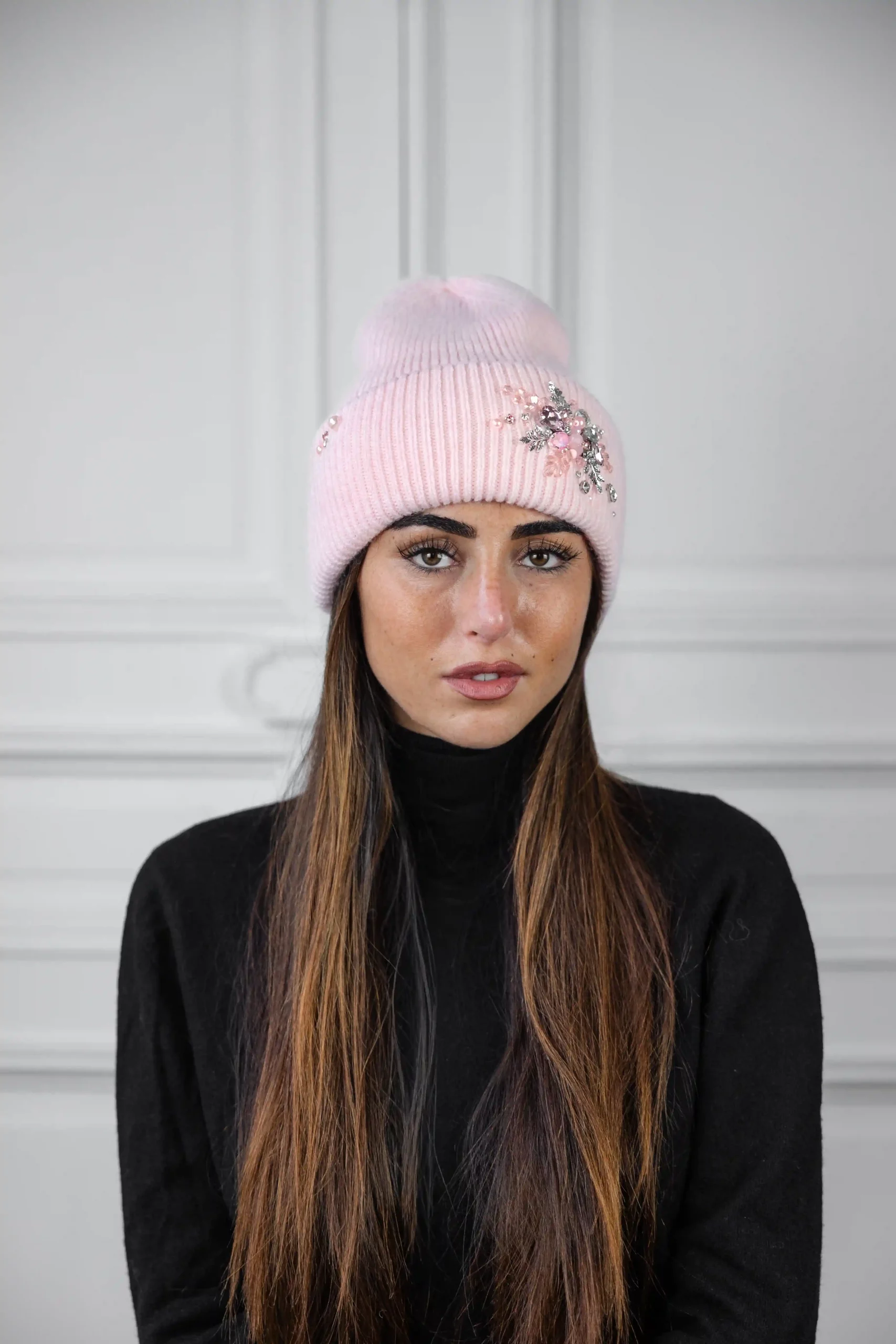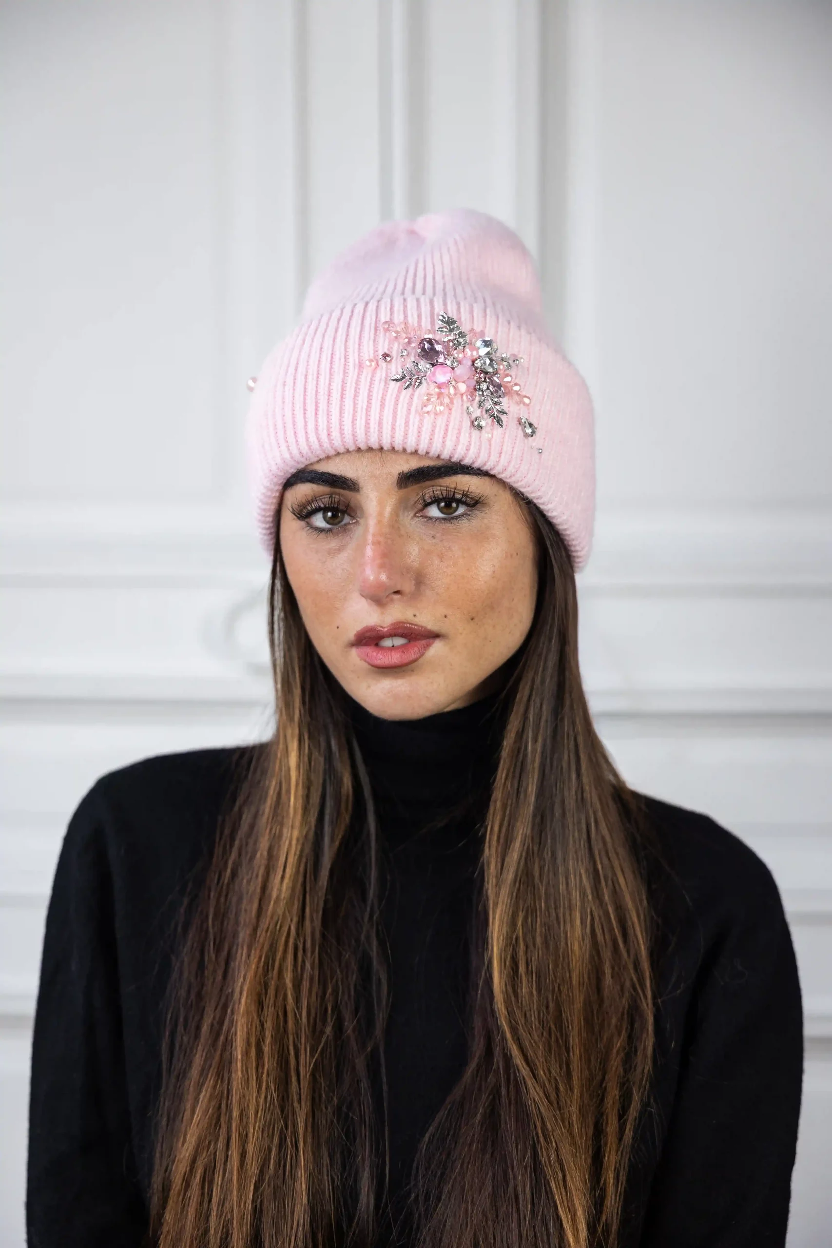 Bonnet rose bonbon en angora, doux et chaud, sublimé par une broderie bijou délicate.