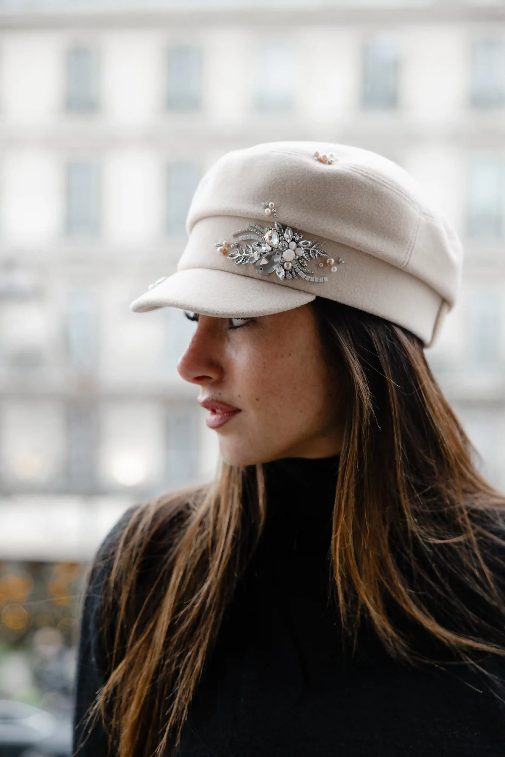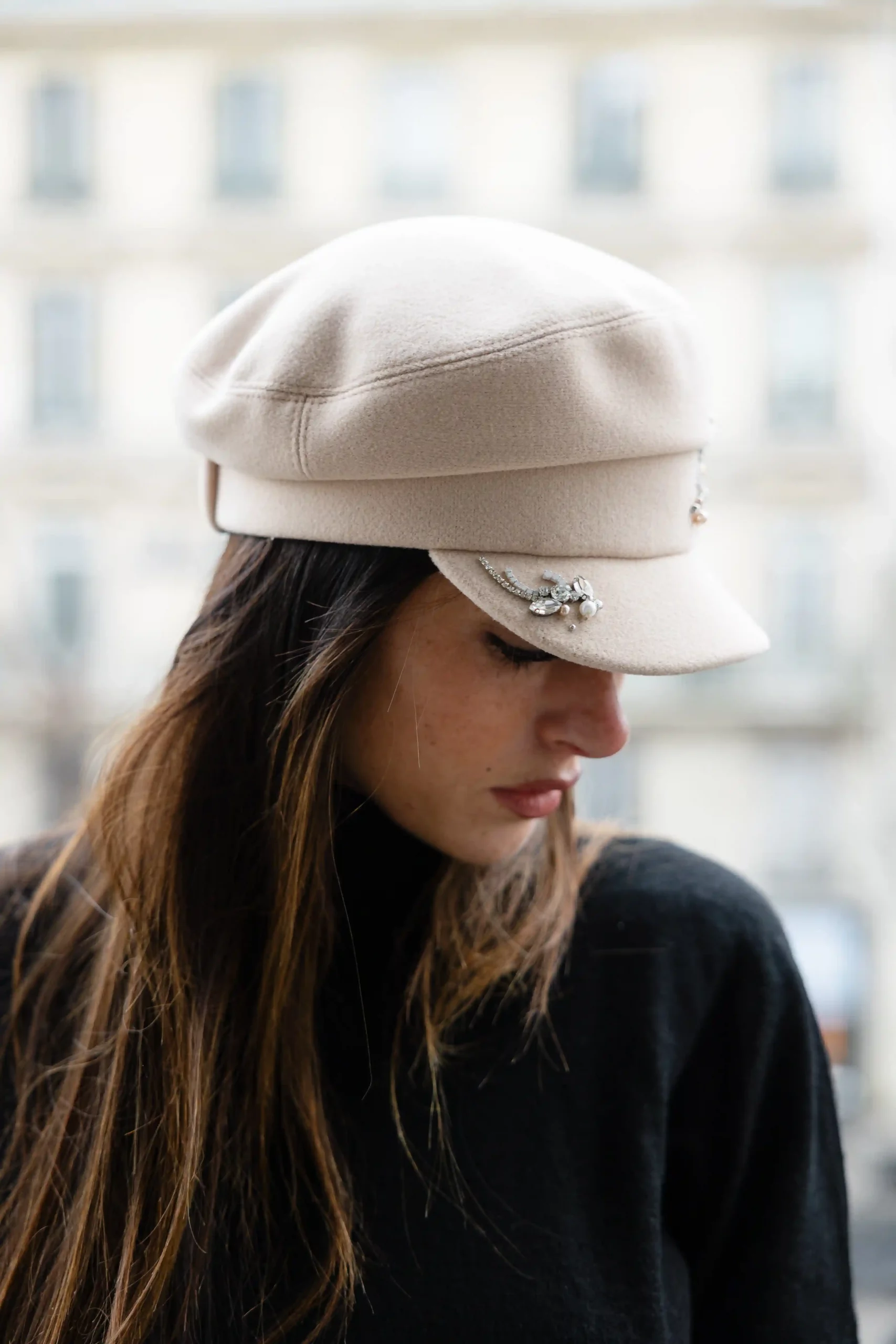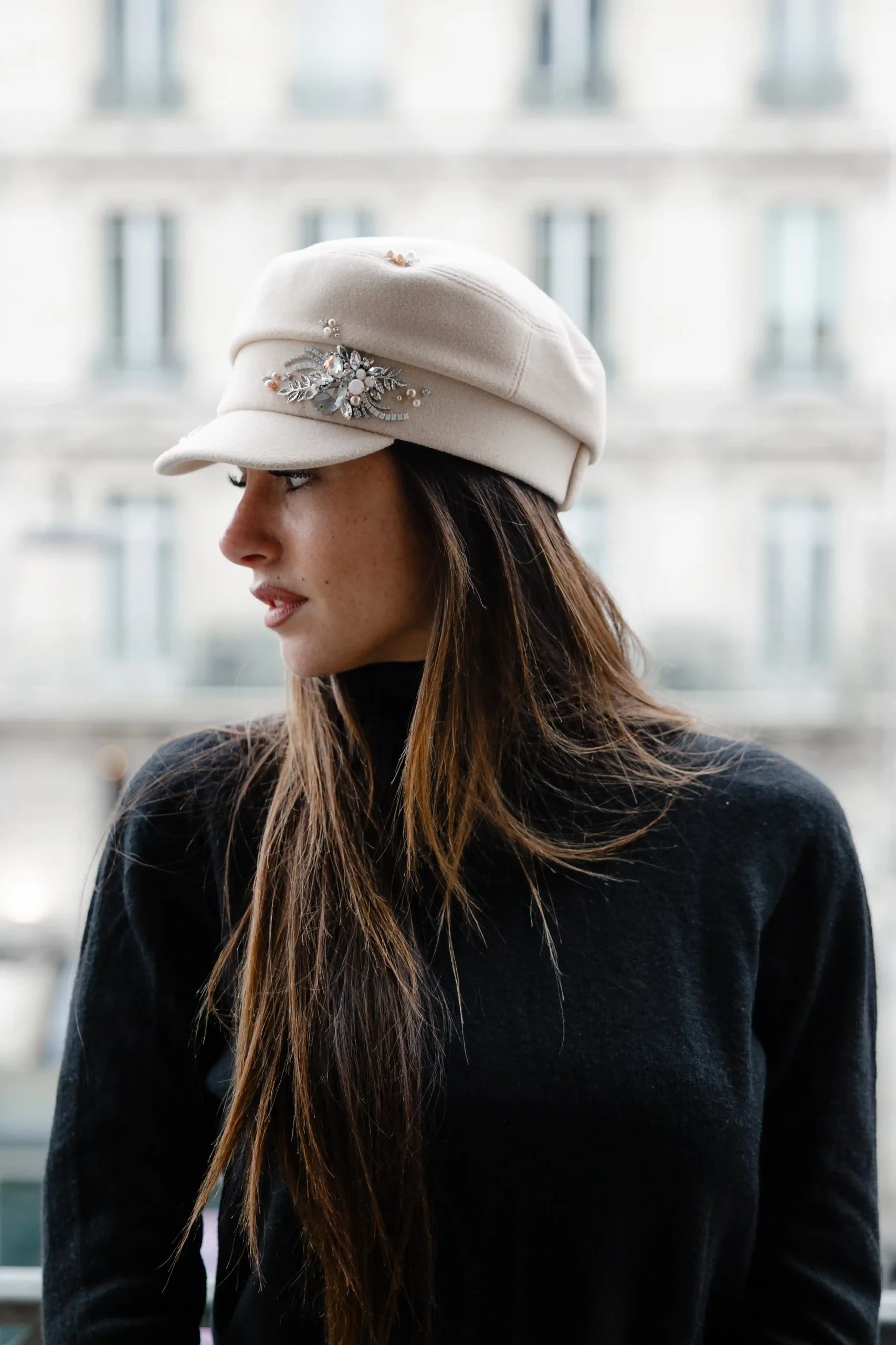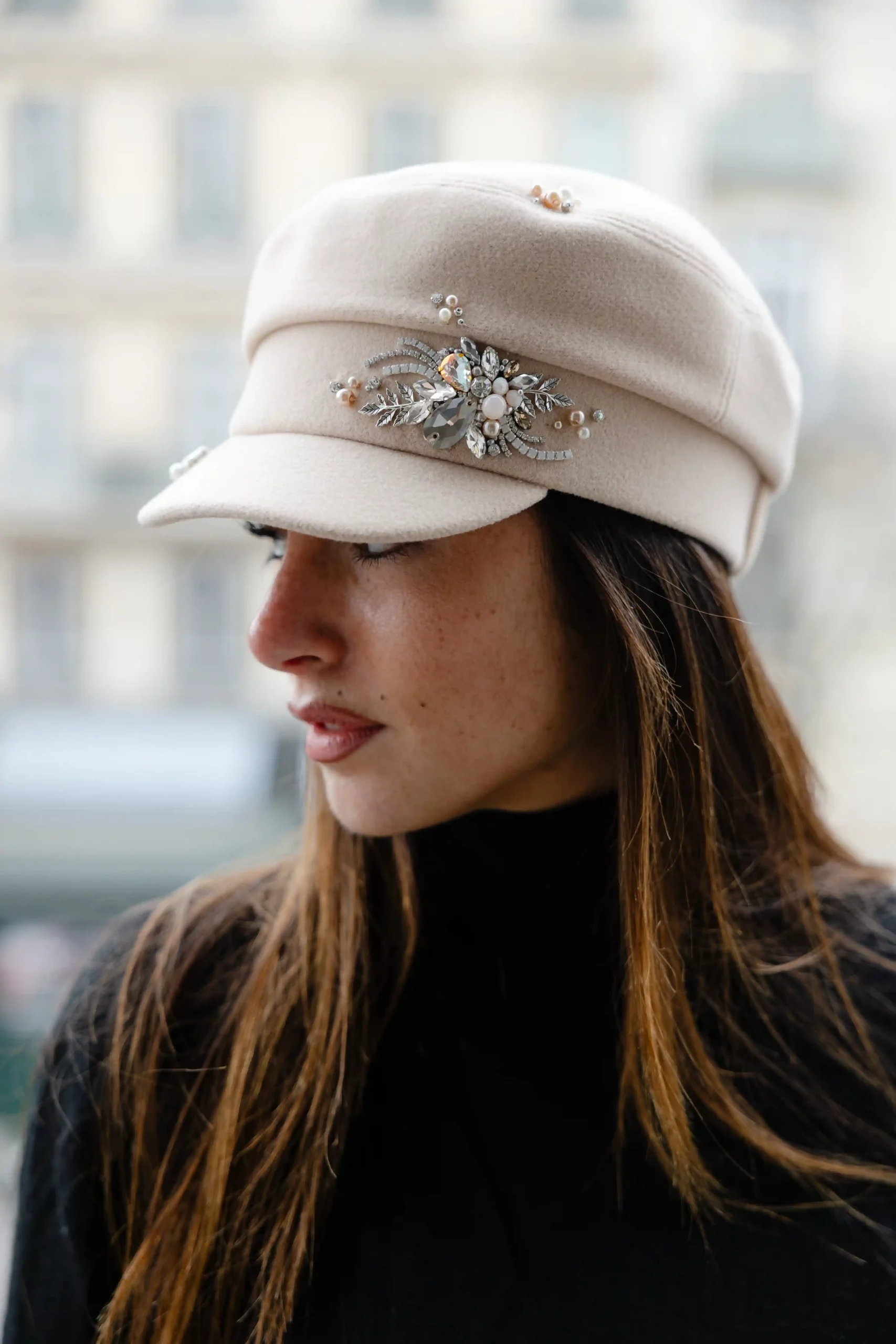 Casquette à la russe beige clair, ornée d’une broderie bijou délicate.