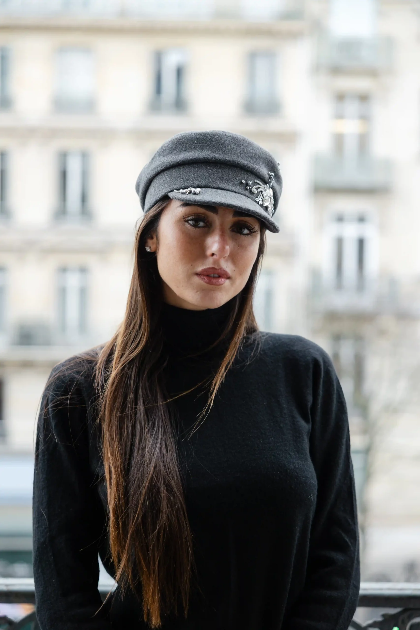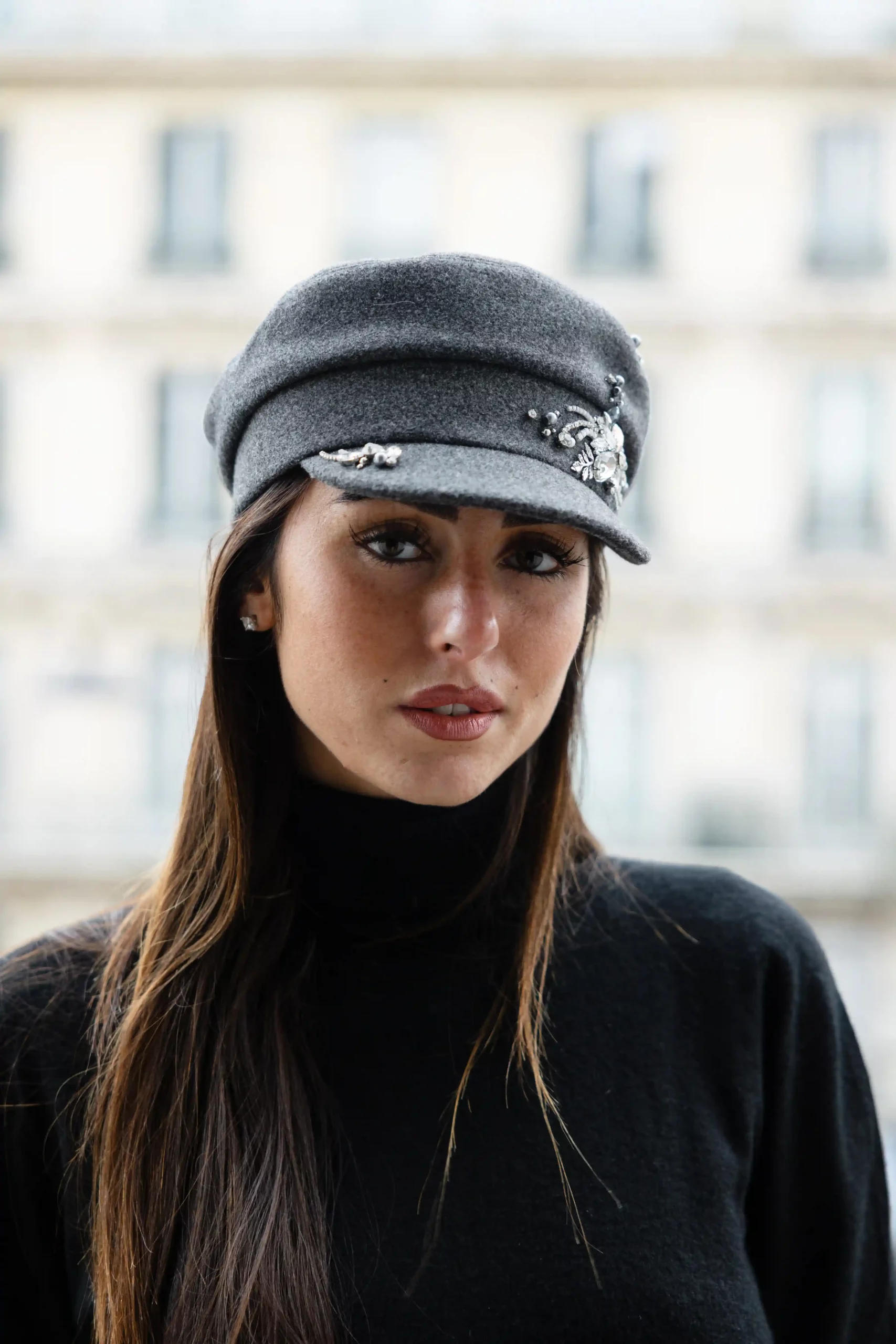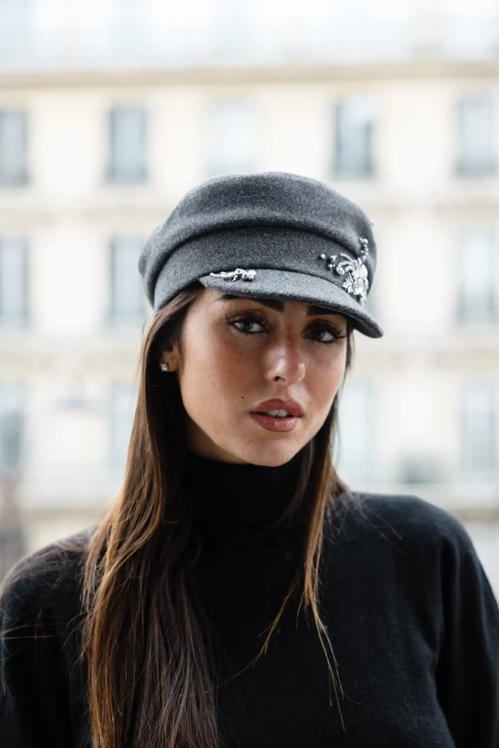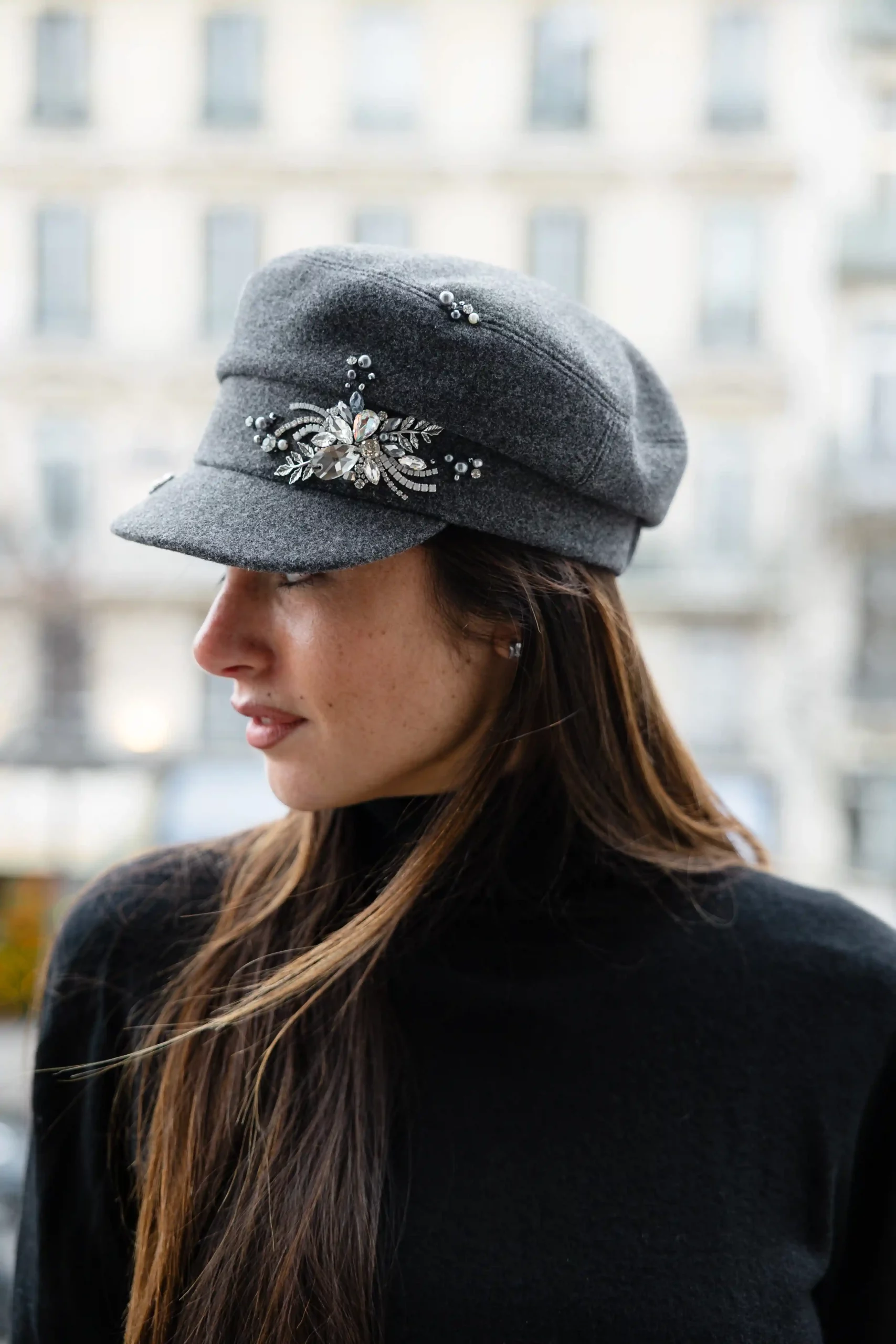 Casquette à la russe gris, ornée d’une broderie bijou délicate.