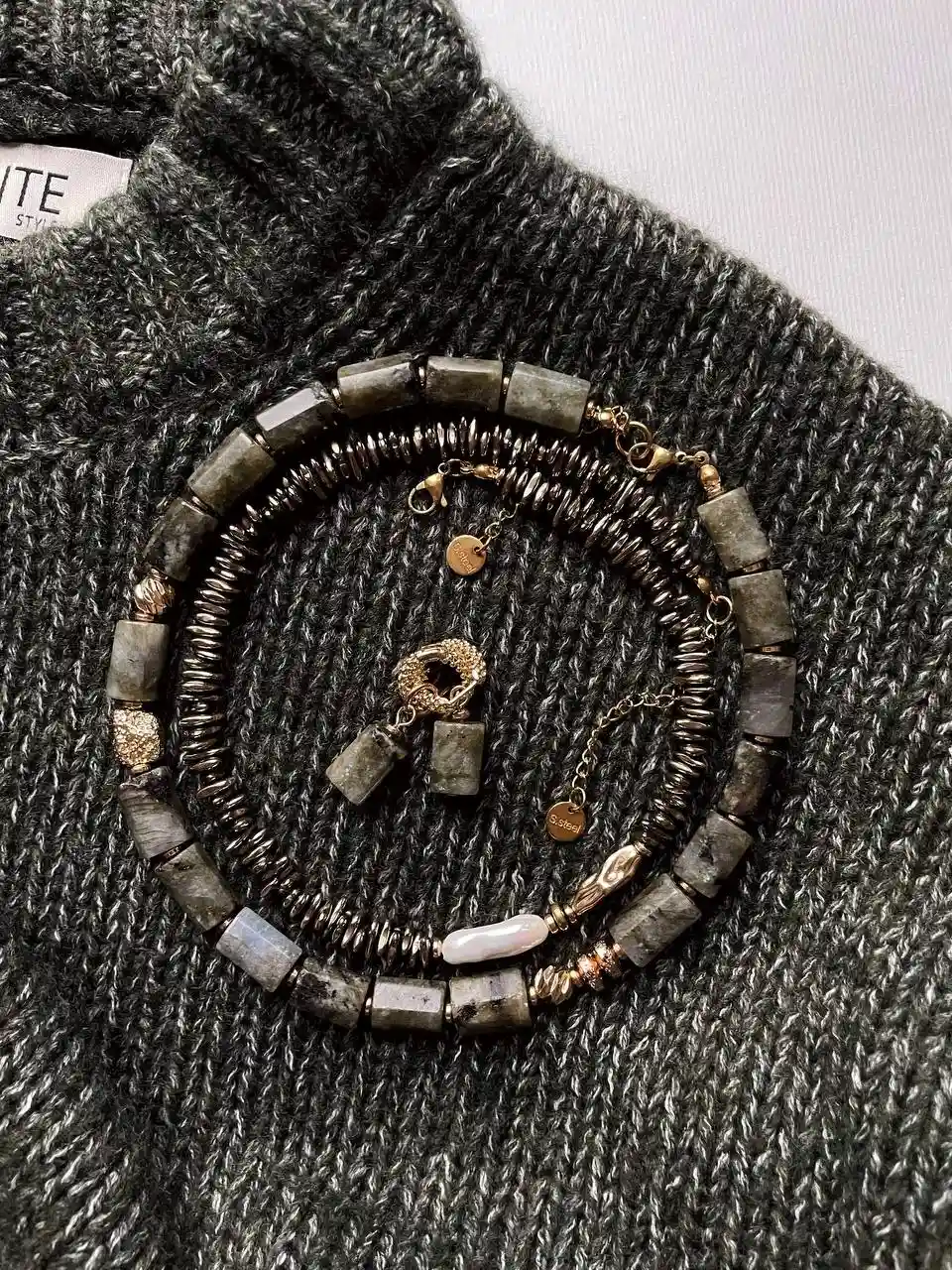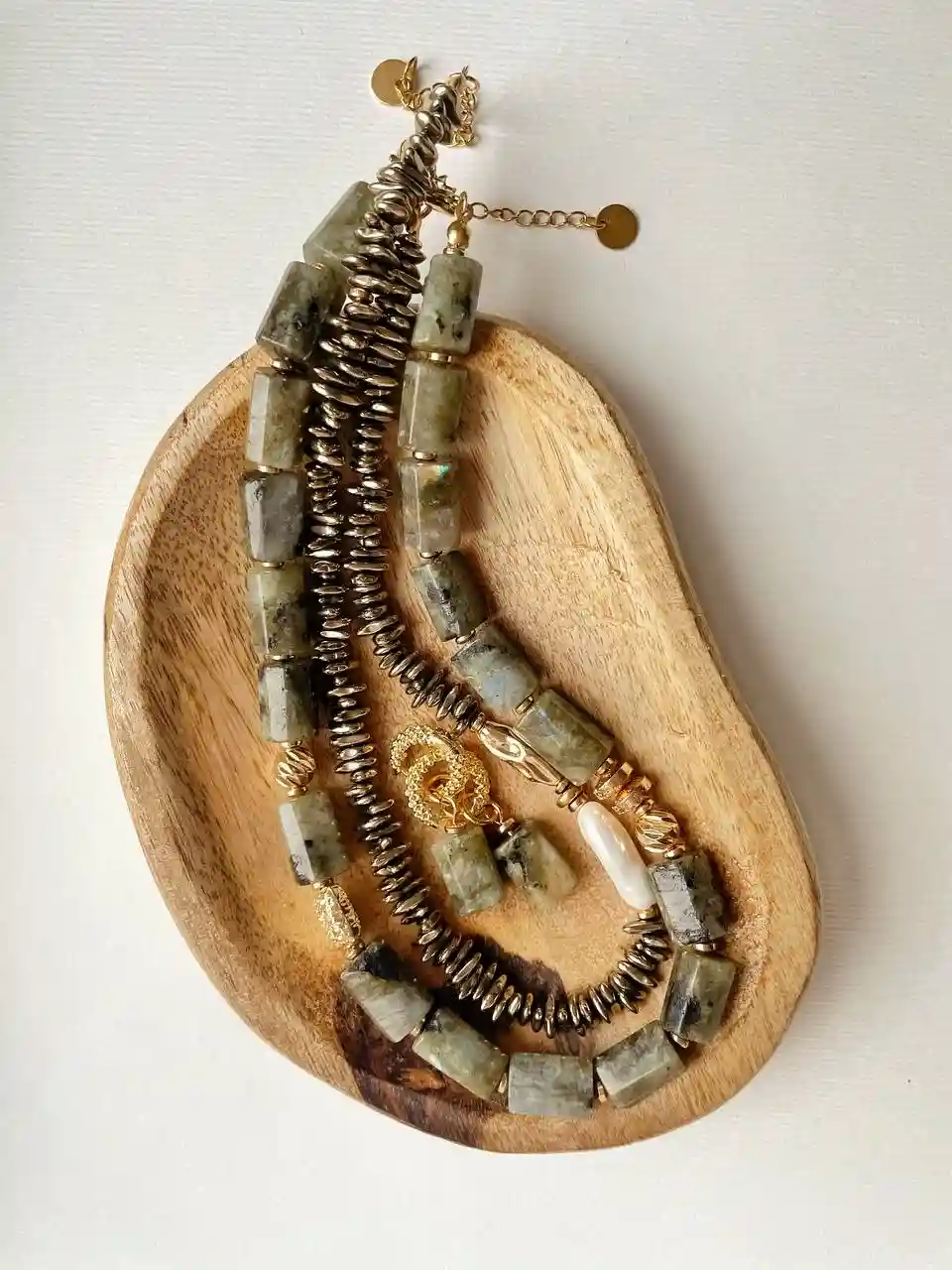 Le collier extérieur, orné de labradorite, captive par ses reflets irisés, changeants comme les aurores boréales. Ses nuances bleutées et vertes, scintillantes à la lumière, apportent une touche de magie et de sophistication à votre tenue.