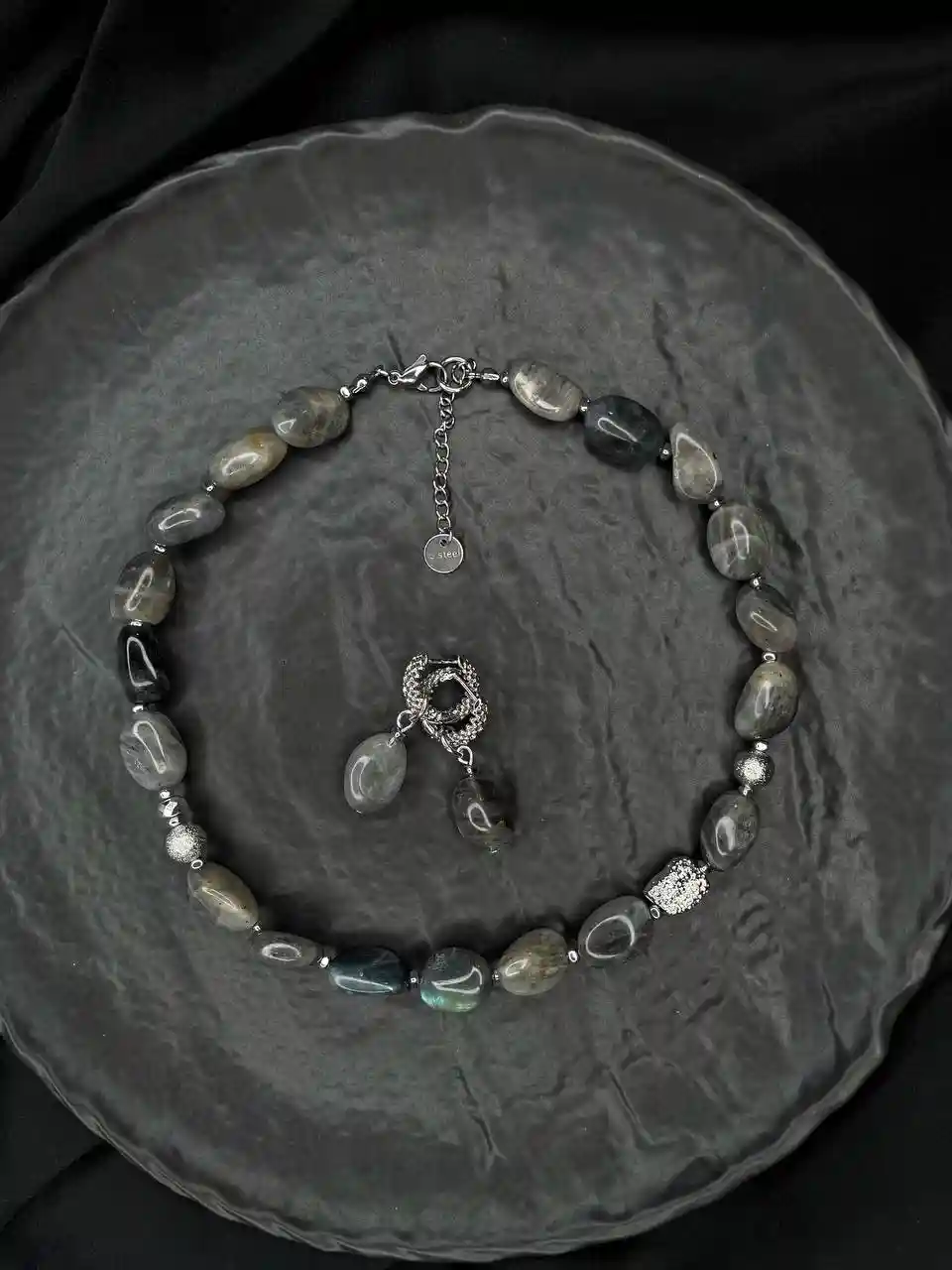 Lumière Lunaire : Collier & Boucles d’Oreilles en Labradorite Gris Argenté
