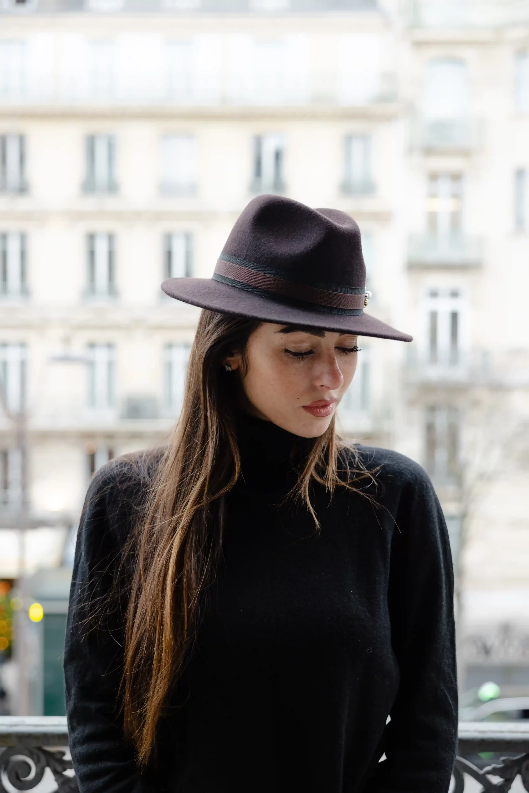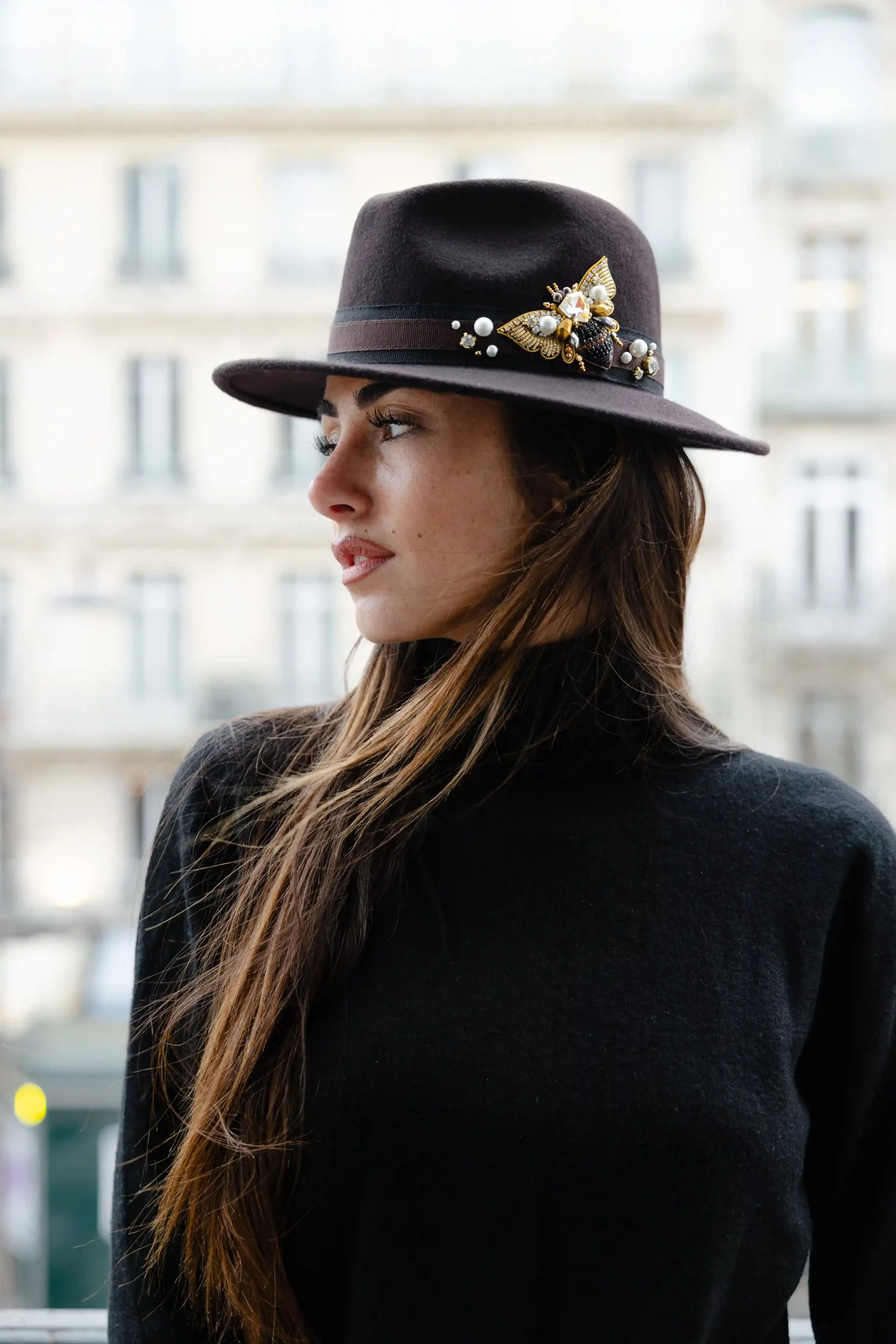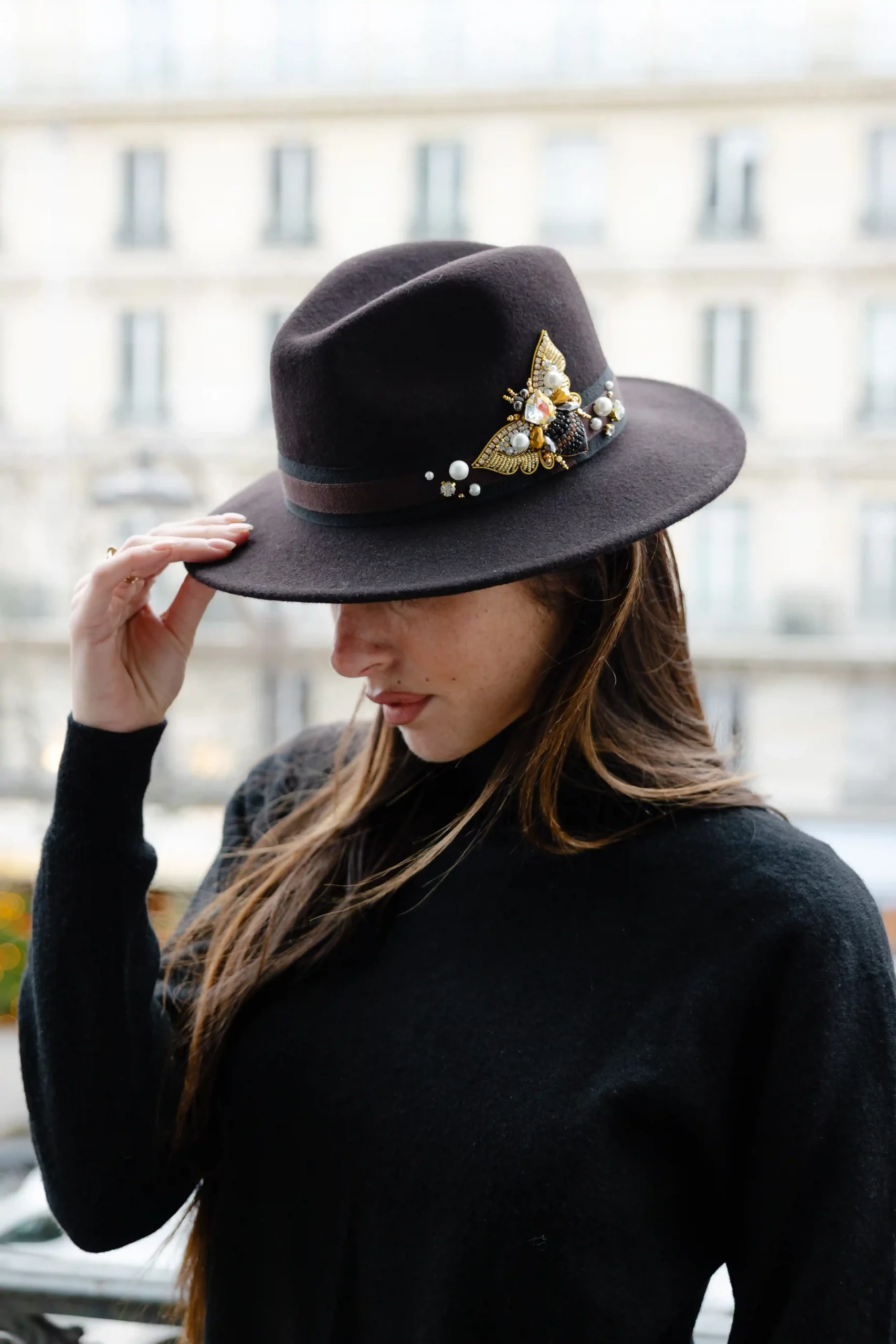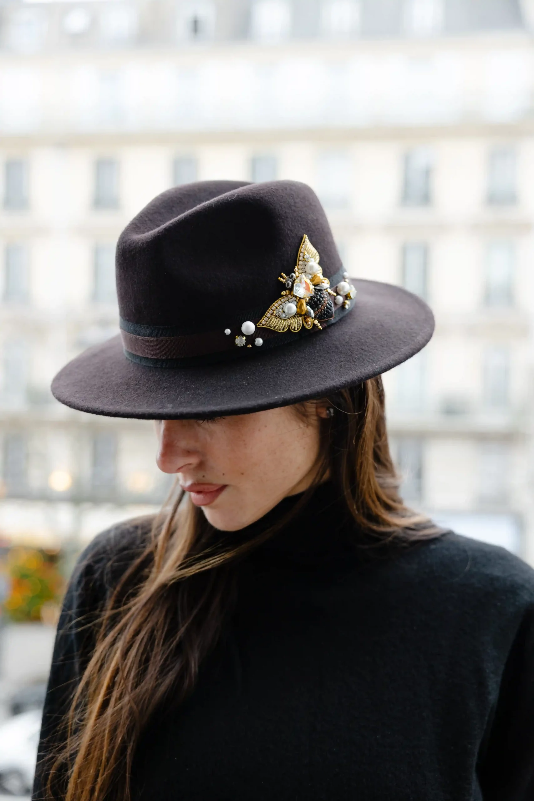 Chapeau fedora chocolat à petit bord, sublimé par une broderie bijou signature abeille.